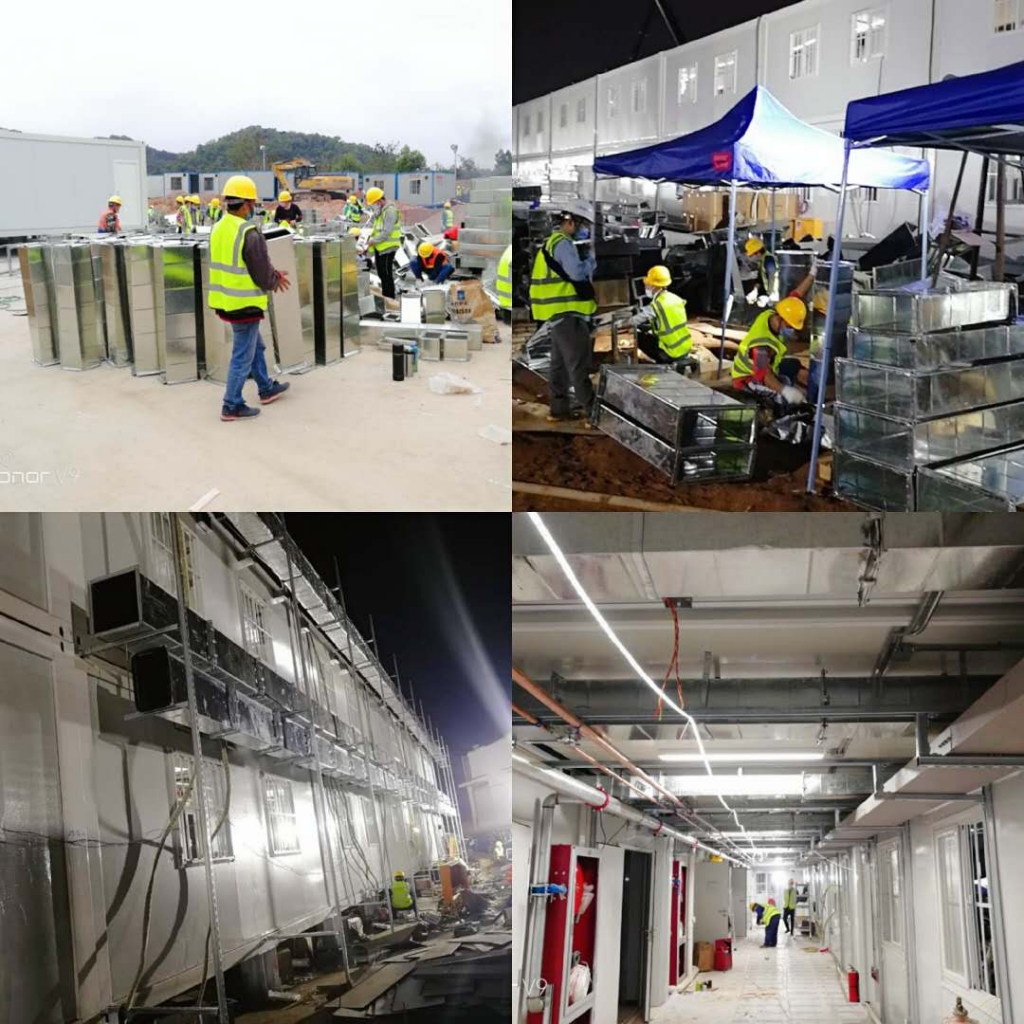 圖為深圳市拓普威節能建設有限公司制作的風管,工人們正在抓緊時間安裝項目所需的風管及材料。