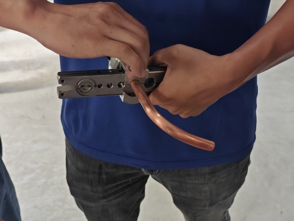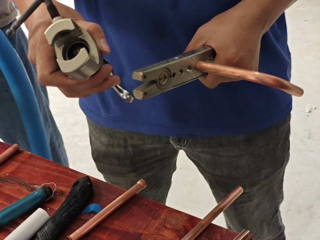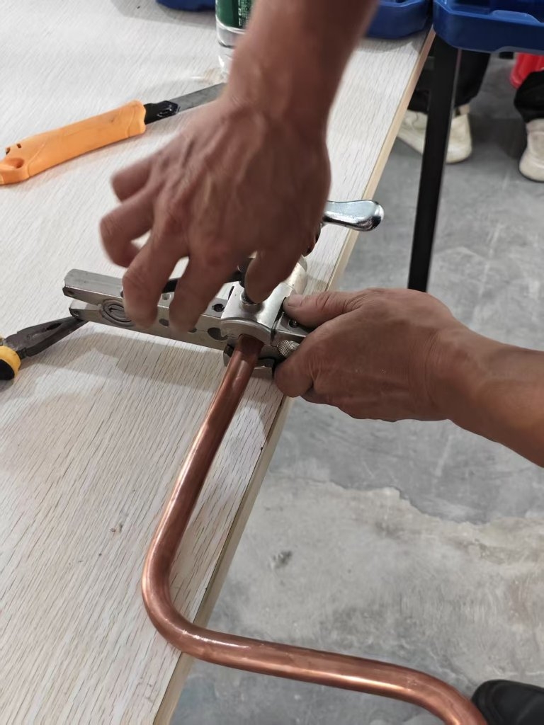培訓分為理論和實操演練兩大模塊,理論課程涵蓋安裝標準與流程、現場現象與人員形象,實操環節則包含六大技能操作的空調擴口、脹管、焊接、保溫、排水、調試等,確保每位參訓人員熟練掌握核心技能。